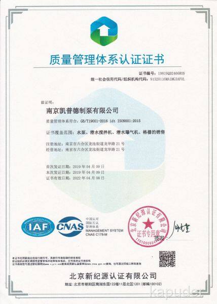 Kapuder Pump Co., Ltd. была основана в июне 1996 года и имеет независимую инновационную торговую марку: KPD. 20-летний опыт в области насосостроения, специализируется на производстве: погружного канализационного насоса, погружного насоса-рыхлителя, погружного перемешивающего устройства, погружного аэратора, решетчатого очистителя. Является профессиональным производителем насосных изделий и оборудования для очистки сточных вод, высокотехнологичным предприятием. Новый завод расположен по адресу: Номер 21, улица Longhua, Liuhe Развитийный район, г. Нанкин. Занимает площадь 40 000 квадратных метров, площадь производственных цехов составляет 28 000 квадратных метров. Следуя американской технологии насосостроения, компания посвящает себя разработке и проектированию погружных насосов и погружных перемешивающих устройств, опираясь на индустриальный дизайн и строгий производственный процесс. Производство и продажи, оснащенные современными производственными, монтажными, контрольными и офисными устройствами, прошла сертификацию системы менеджмента качества ISO 9001, сертификацию системы экологического менеджмента ISO 14001. Продукты компании получили одобрение большинства пользователей.